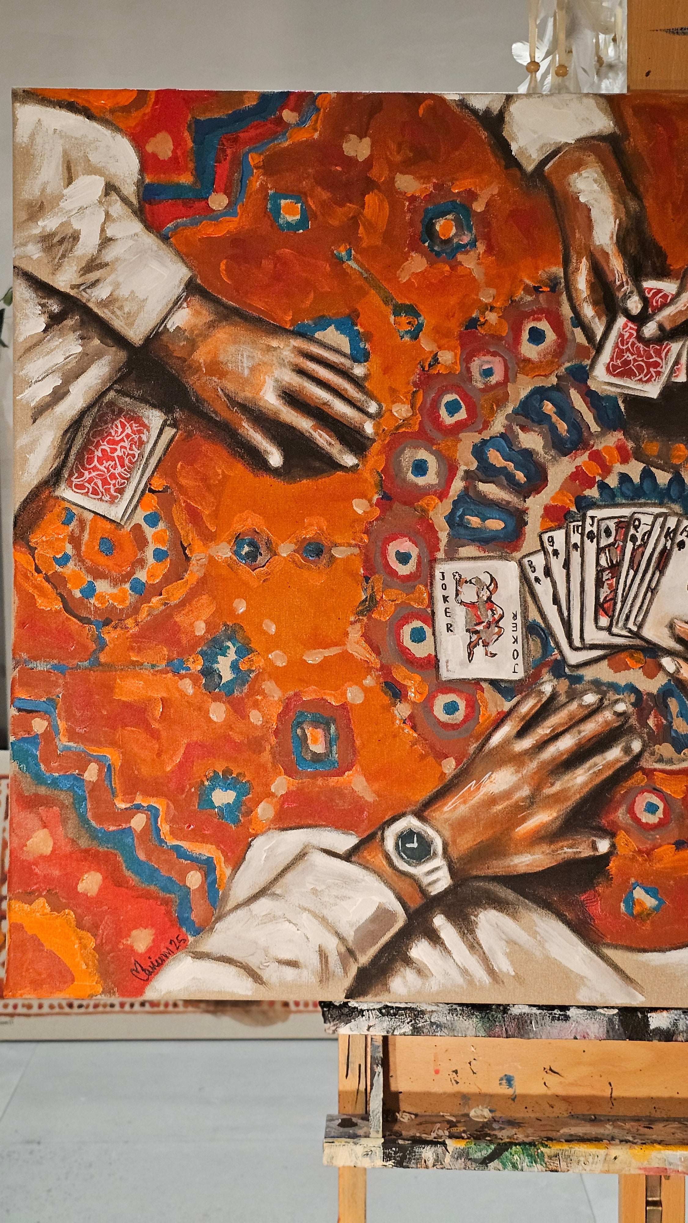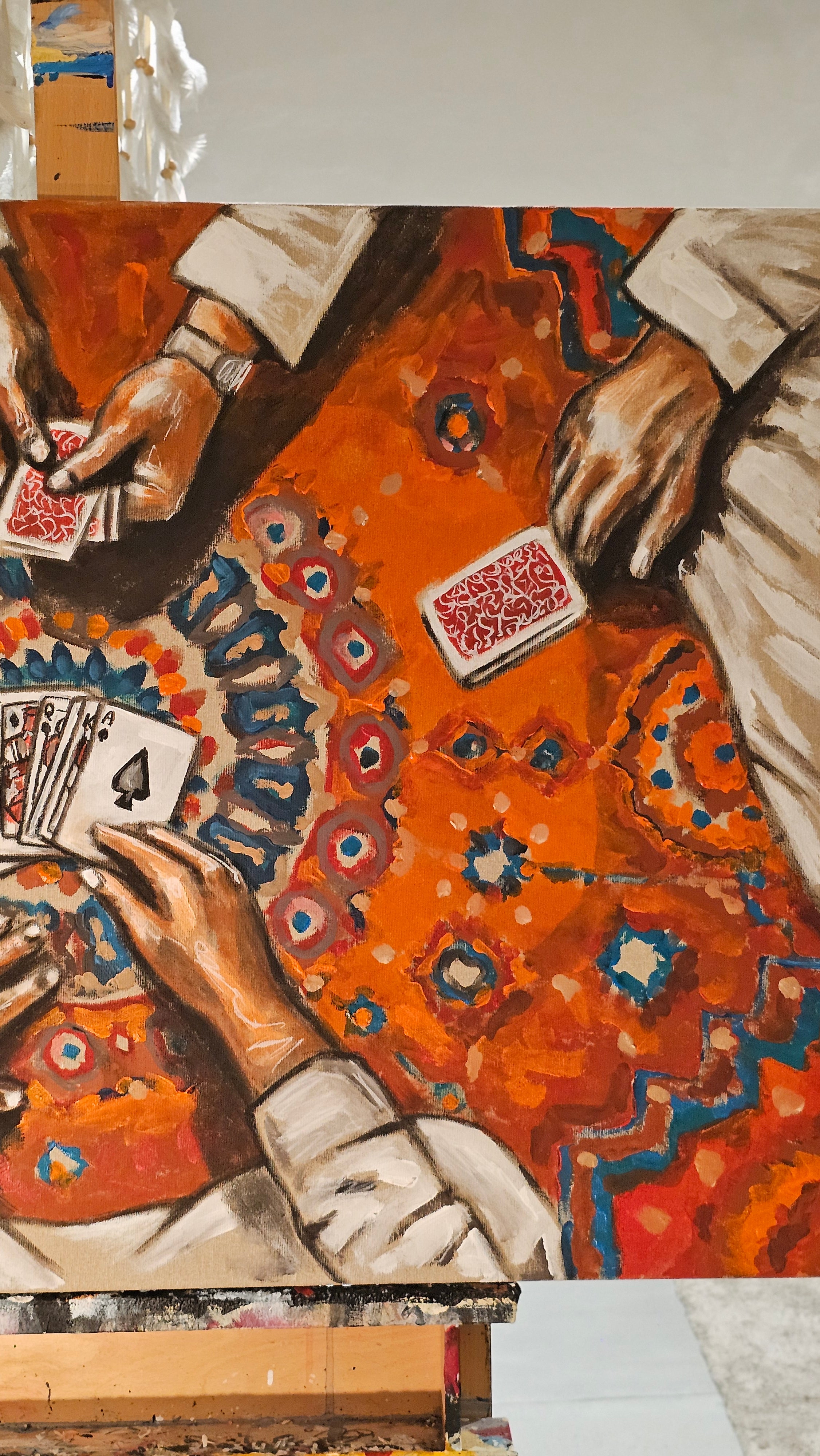 Dimensions: 100 cm X 70 cmStyle: figurative abstractMediums: canvas, acrylic colors, acrylic medium, markers,on brown linen Canvas, Wood