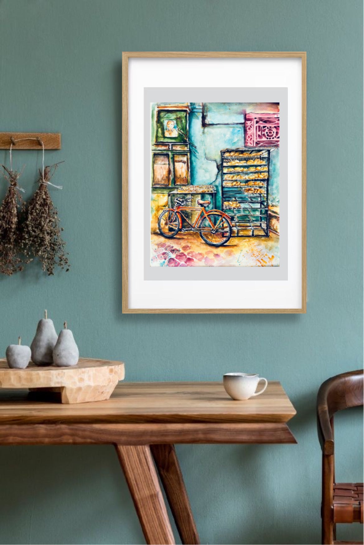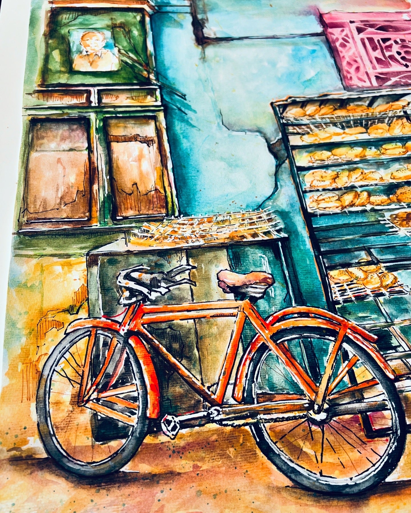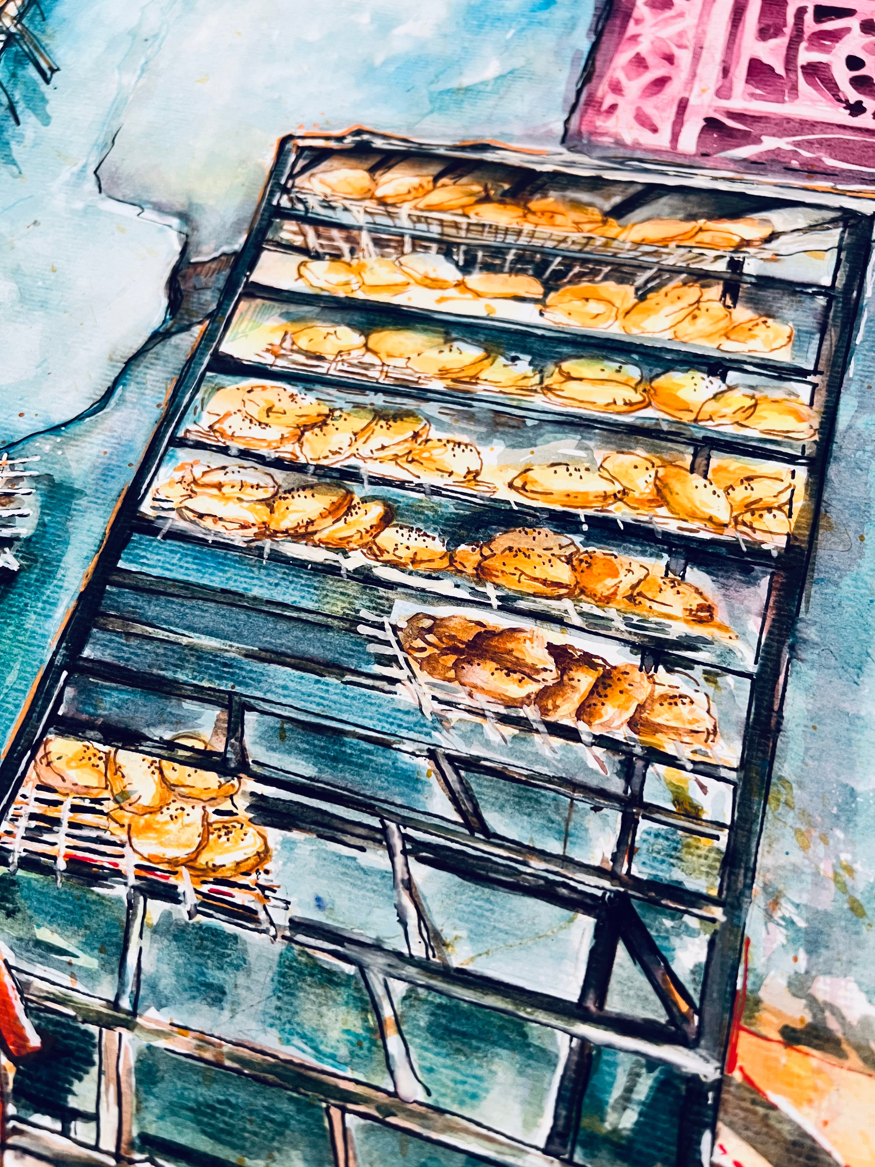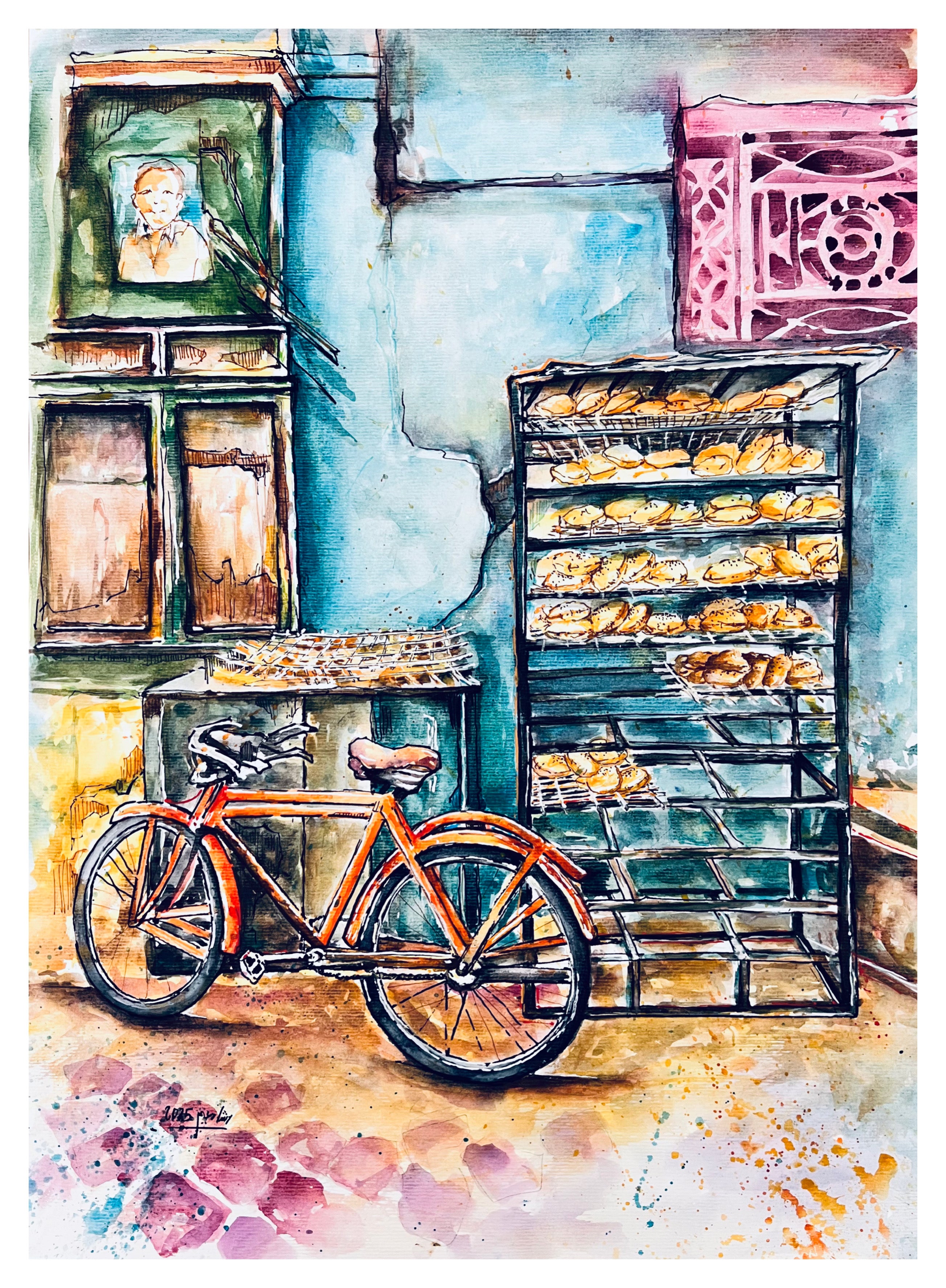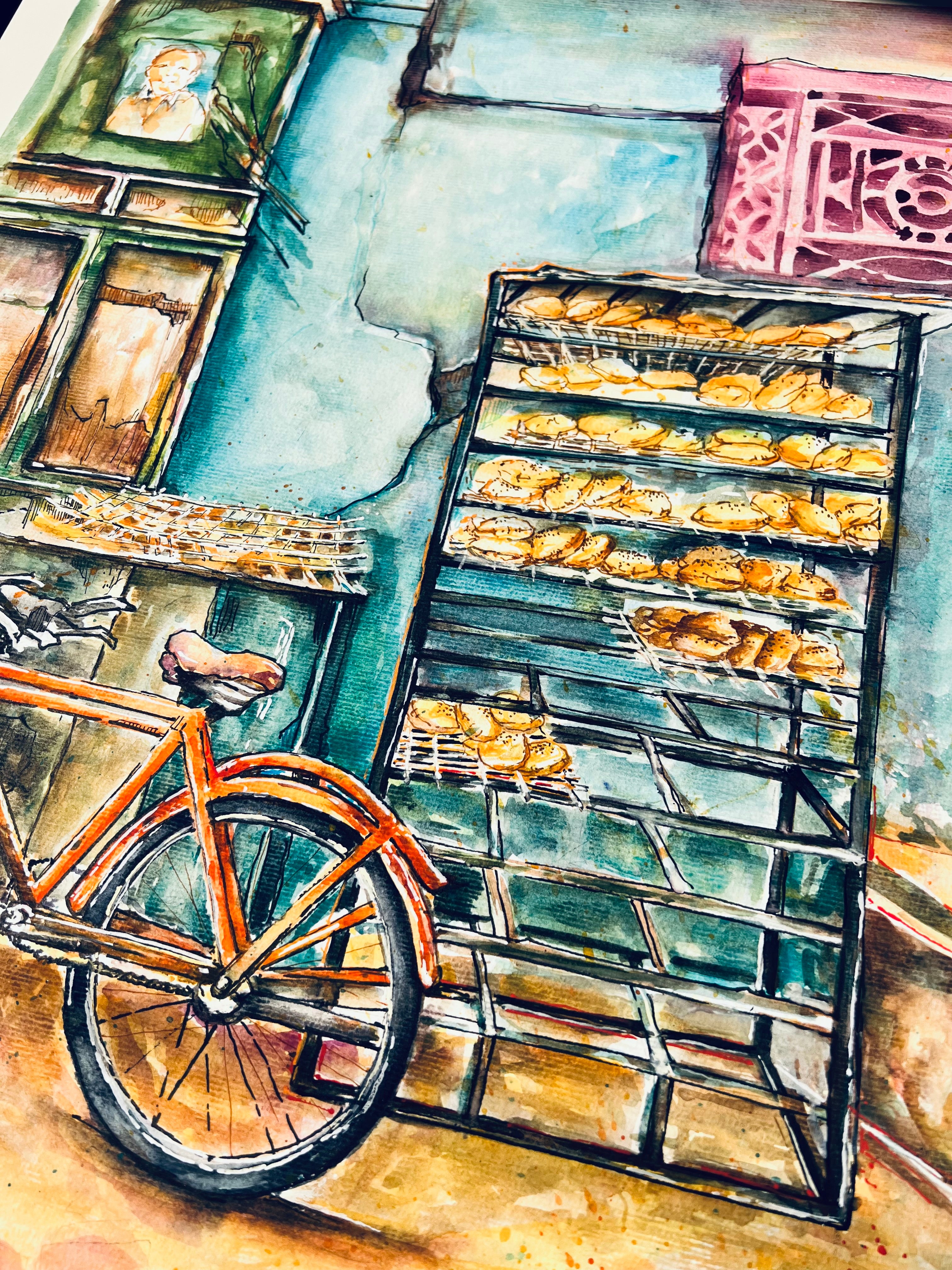 This watercolor painting captures an old local traditional Balady bread in downtown Egypt.